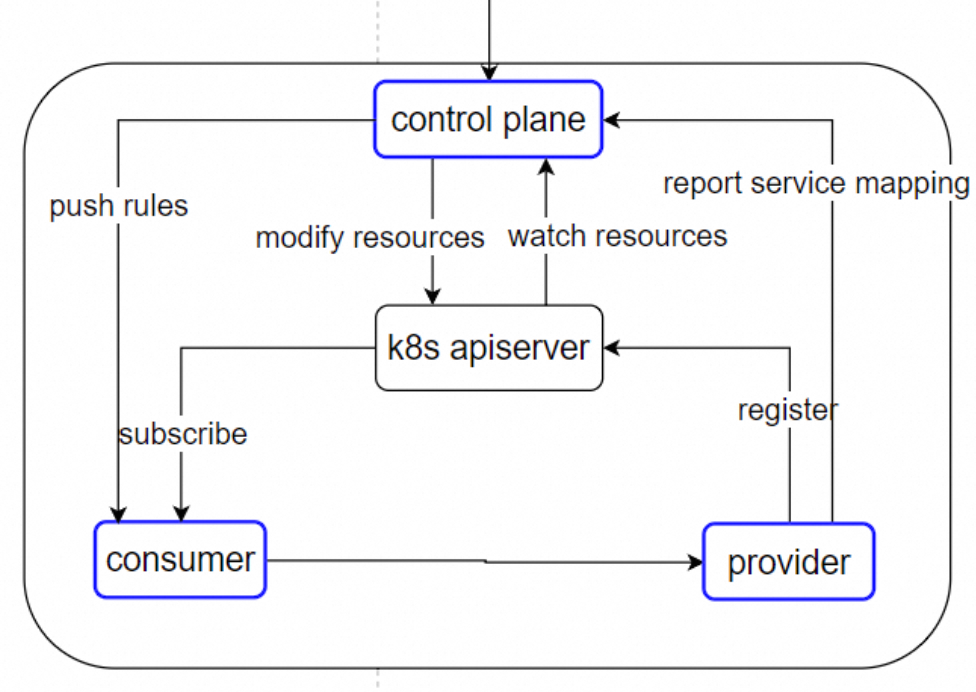 在这种模式下,服务发现与用户的部署运维操作形成统一,用户定义标准的 Kubernetes Service、Deployment,并将其部署到 Kubernetes,之后 Control Plane 通过监控 APISERVER 资源并与 SDK 进程联动,形成一整套的服务发现体系。